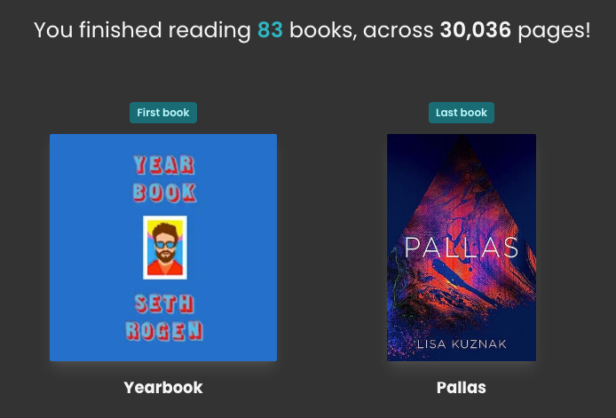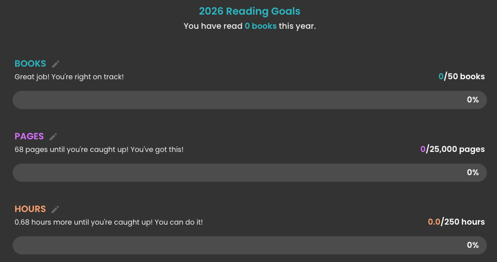 The Storygraph allows for more than just a books goal, which is so cool. Based on what I did this year, 83 books, ~30k pages, ~280 hours, this is what I chose:I don’t like setting huge goals because then it feels like pressure to meet them, which isn’t what relaxing and enjoying stories is about. So coming in under what I did this year allows for some fun stat building without being like QUICK BINGE SOMETHING and it becomes more about the numbers than just enjoying books. Gotta keep that balance.