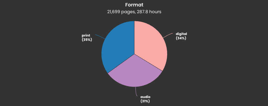 There are a lot of things I love about The Storygraph, but among those things is that it tracks format and pages and hours, and each edition separately has it’s own stats. So I read the Locked Tomb Series once in paper and once in audio, and those counted as pages read and then hours listened separately.