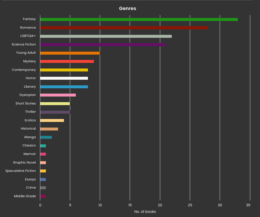 Until I started using The Storygraph, I never would have considered myself a Fantasy reader. I often forget that Fantasy covers so many subgenres, not just high fantasy, which I do enjoy but I read across such a broad range of genres. But for the past two years, based on The Storygraph’s genre tagging (of which books always have multiples), Fantasy always comes in first.