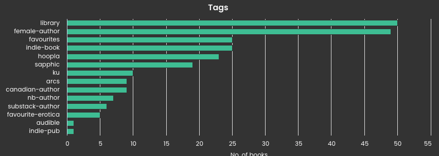 I don’t often prescribe to genres, because shit gets labeled strangely especially on sites like this. But it’s a fun graph to look at. Like ‘erotica’ is only at four, which is silly given how much smut I read this year. And LGBTQIA+ is not a fucking genre, I hate that. Stick the gay books in with the hetero books of the same genre, ffs.
