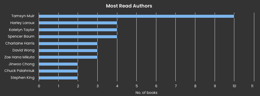If Alecto comes out this year (please, if there is a god, please), this graph will inflate my Tamsyn obsession dramatically. HOWEVER. My next decree for 2026: I’m not going to include rereads in my MVP bracket. Because my favourites will just win every year. Which isn’t as fun. XD And I know I’m going to reread this series at least once this year (twice if Alecto is announced). And I plan to finally finish the Acts of Caine series, which means Blade of Tyshalle is gonna win.