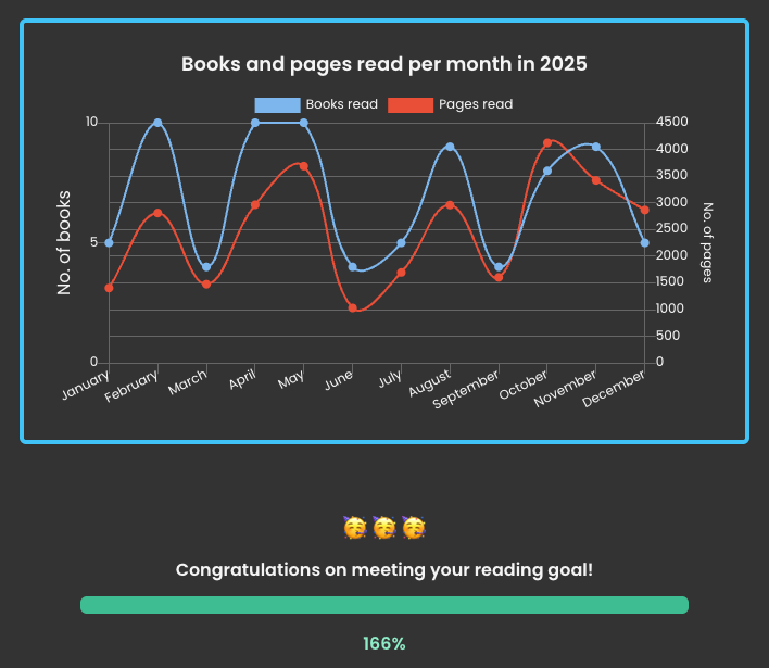 Anyway, my 2025 reads are very well tagged and whatnot, so my stats are glorious! I didn’t log my daily reading, though, and I want prettier graphs, so my first decree of 2026 is that I will be logging my reading every day. You’re welcome, future Emily who gets to enjoy the fruits of this labour.